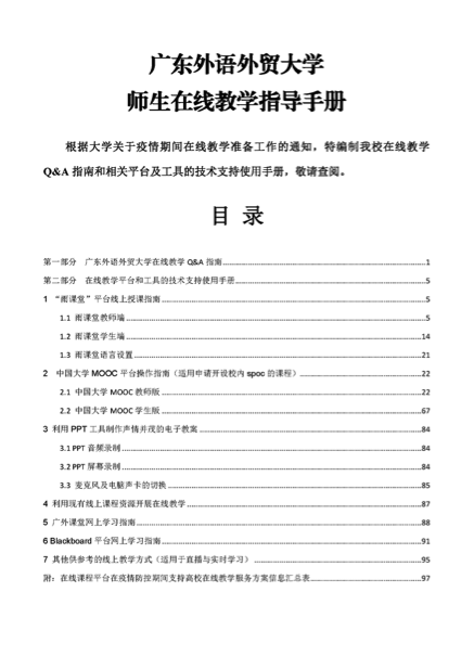 为更好地服务于校内师生开展在线教学,教务处联合网信中心编制《广东外语外贸大学师生在线教学指导手册》,通过多次测试及沟通,确定切实可行的教学实施路径,努力为教师探索多种线上教学模式,详细、清晰地引导学校师生使用在线教学资源。